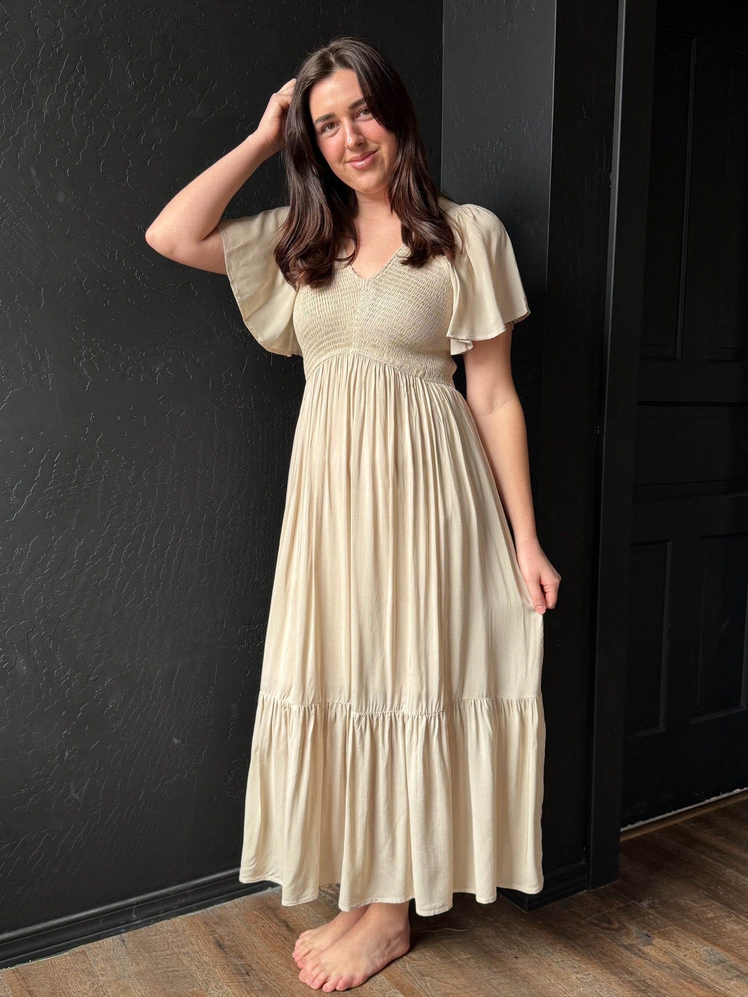 This is the dress our customers ask for by name — and for good reason. Our best-selling boho-inspired midi dress is back, and it’s just as flattering, easy, and wearable as you remember. Designed with a feminine V neckline and fluttered short sleeves, it features smocking at both the front and back for a comfortable, flexible fit that moves with you. The ruffle hemline adds soft movement, while the midi length keeps it perfect for everything from casual days to special moments. Finished in a dreamy Cashew Milk, this is one of those throw-on-and-feel-beautiful pieces you’ll reach for again and again.