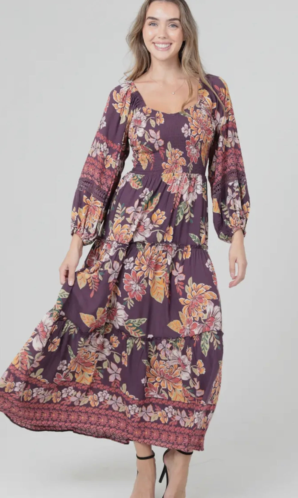 Jade Smocked Sweetheart Bodice Long Sleeve Maxi Dress