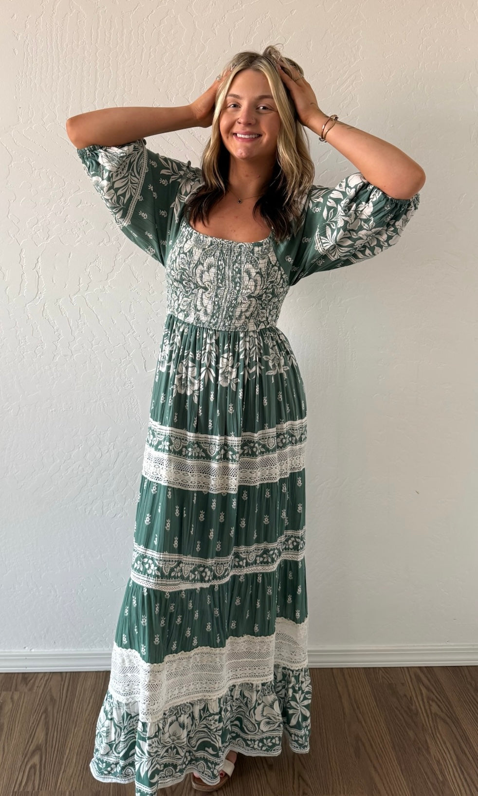 Olof Smocked Bodice Lace Trim Maxi Dress