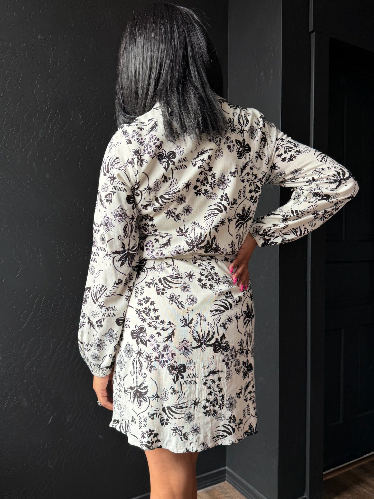 Make a bold statement in this effortlessly chic abstract mini dress. Designed with a striking black and white print, this piece blends modern edge with timeless tailoring. The structured collar and button front details give it a polished feel, while the adjustable waist side tie cinches you in for a flattering, feminine silhouette. Long sleeves add balance and versatility, making it perfect for transitioning between seasons. Style it with boots for an elevated everyday look or dress it up with heels for a sleek night-out vibe.