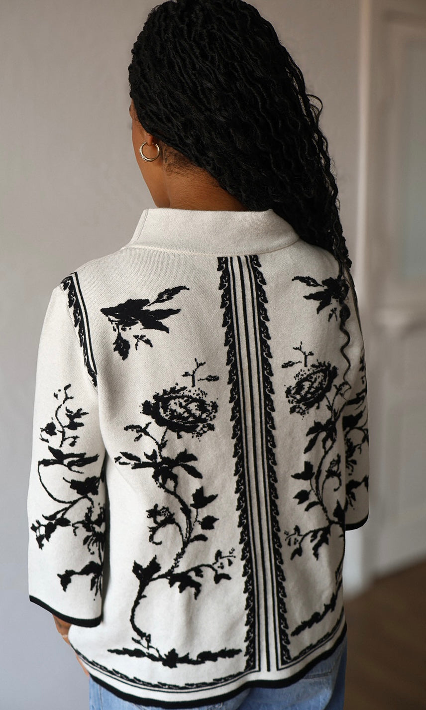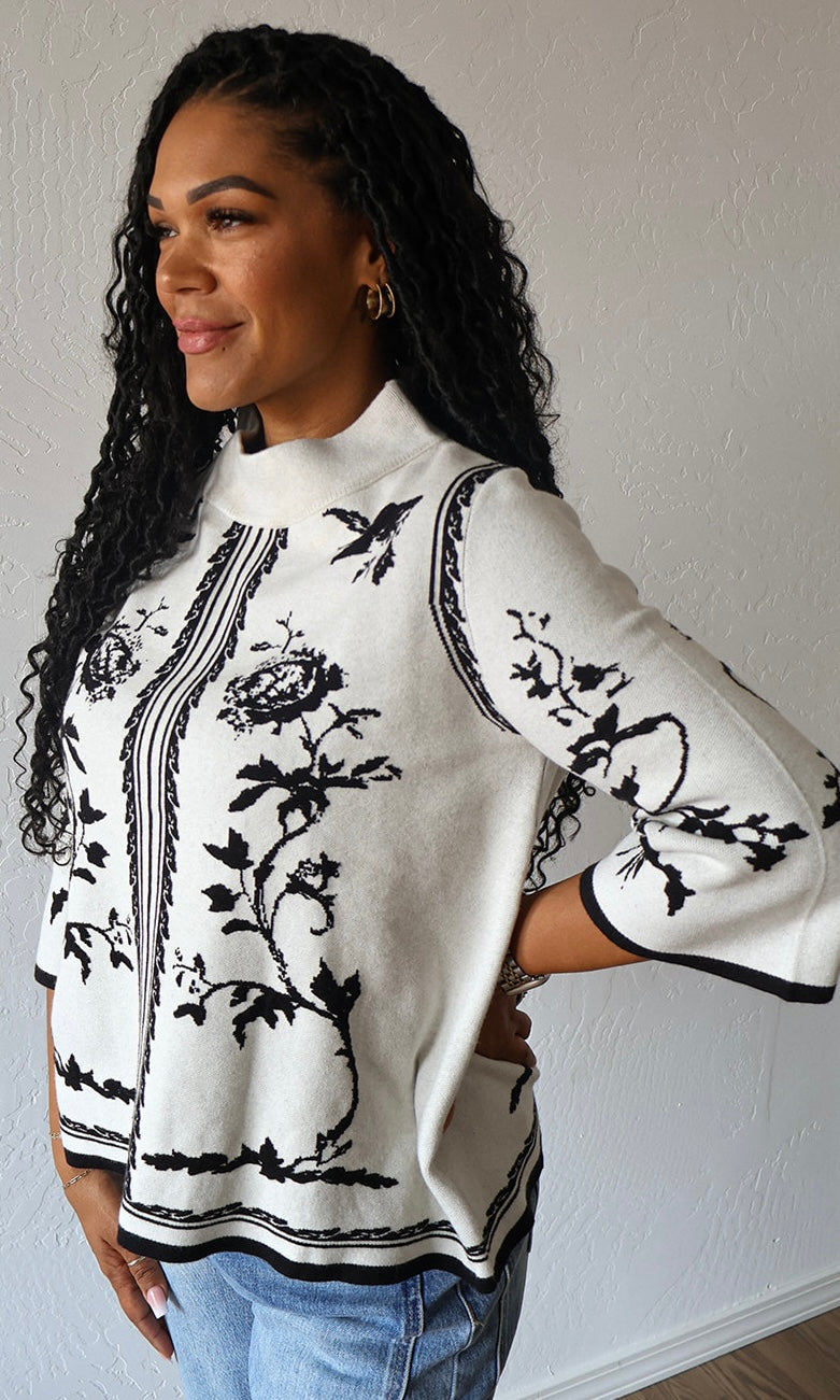 Honey Contrast Border Pattern Jacquard Knit Mock Neck Sweater