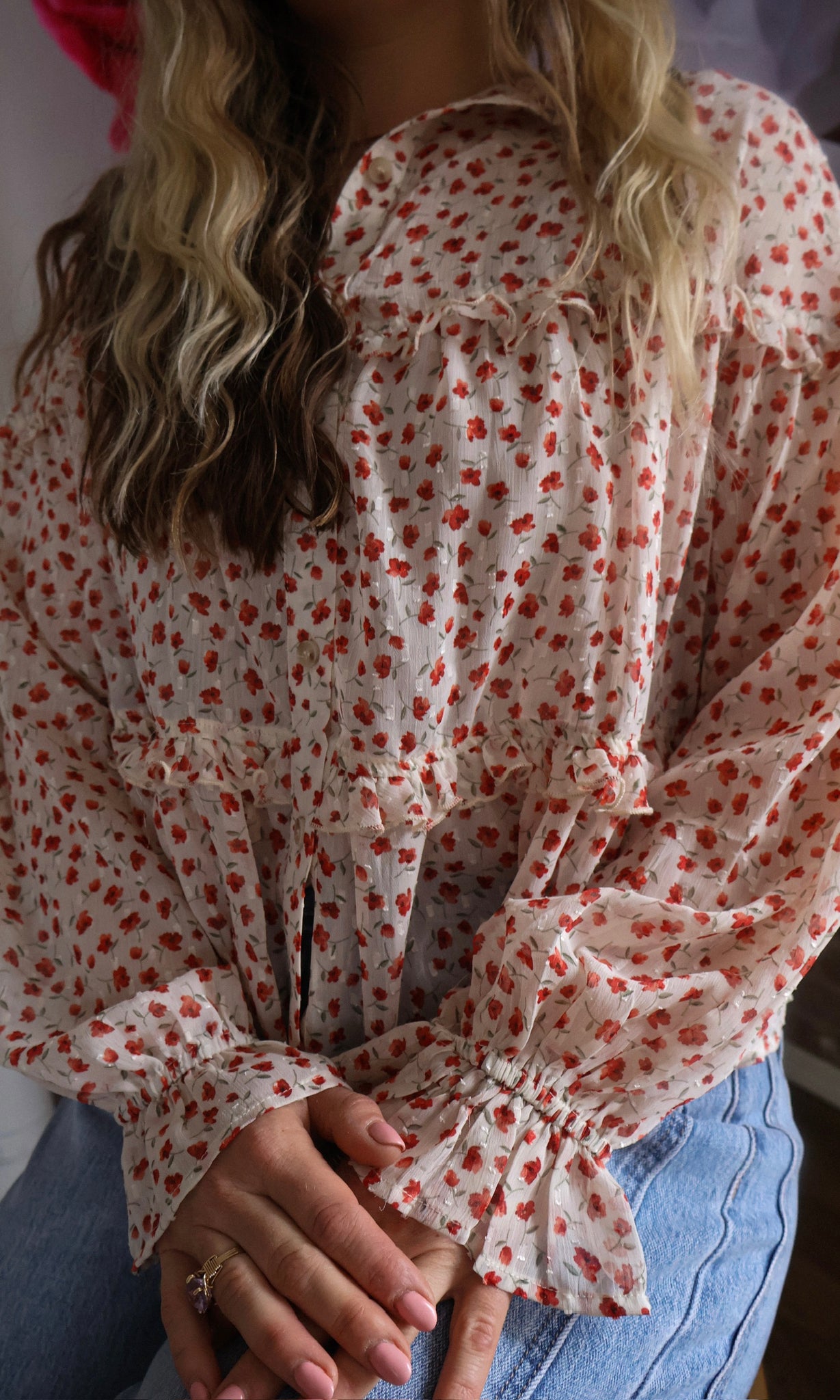 Clipdot chiffon floral print ruffled blouse