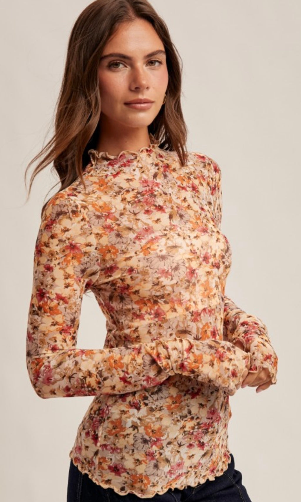 Maria Floral Mesh Print Mock Neck Long Sleeve