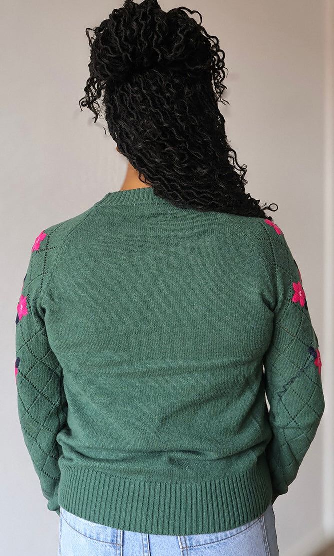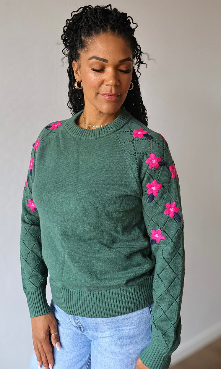 McKenzie Green Floral Embroidered Crew Neck Sweater