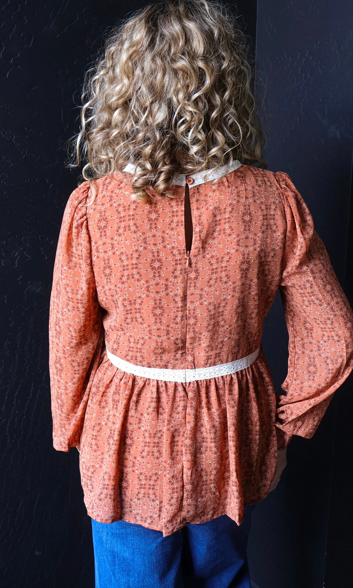 Ollie Rust Lace Trim High Neck Peplum Blouse