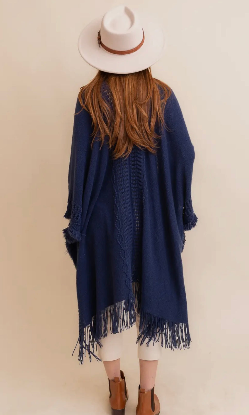 Porter Navy Open Work Frayed Border Bohemian Ruana