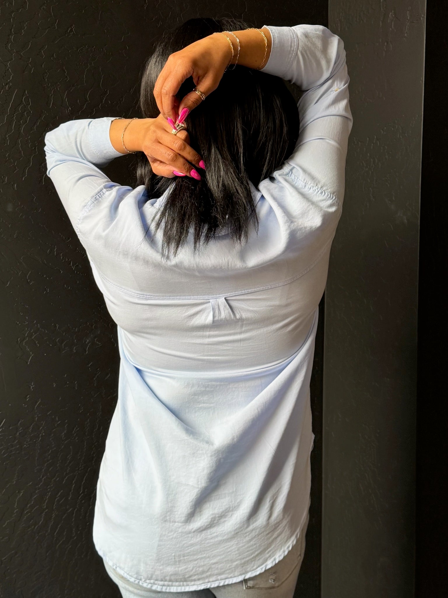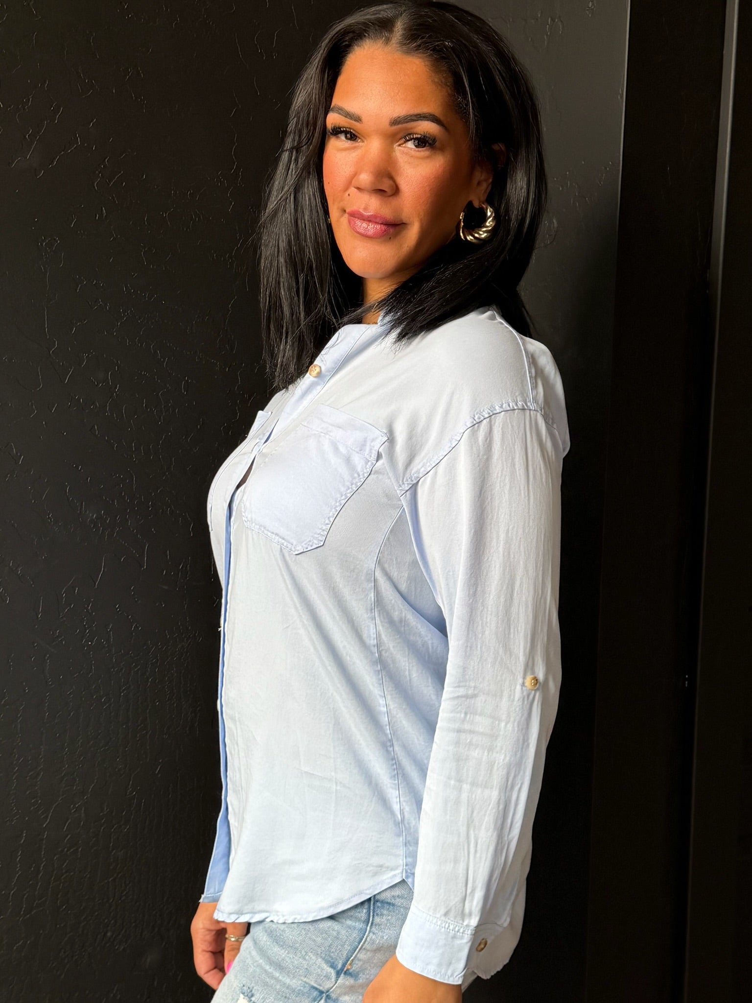 This is the kind of piece you throw on once and immediately understand why it’s a closet favorite. Made from soft-washed Tencel, this oversized button-down shirt feels incredibly lightweight and smooth, with an easy drape that gives it that effortlessly relaxed look. Designed with rollable cuffs, chest pockets, and a classic button-down closure, it hits just below the hip for versatile styling—wear it open over a tank, half-tucked into denim, or buttoned up for a laid-back polished vibe. Finished in the Blue Sky shade, it’s an easy, everyday layer you’ll reach for year-round.