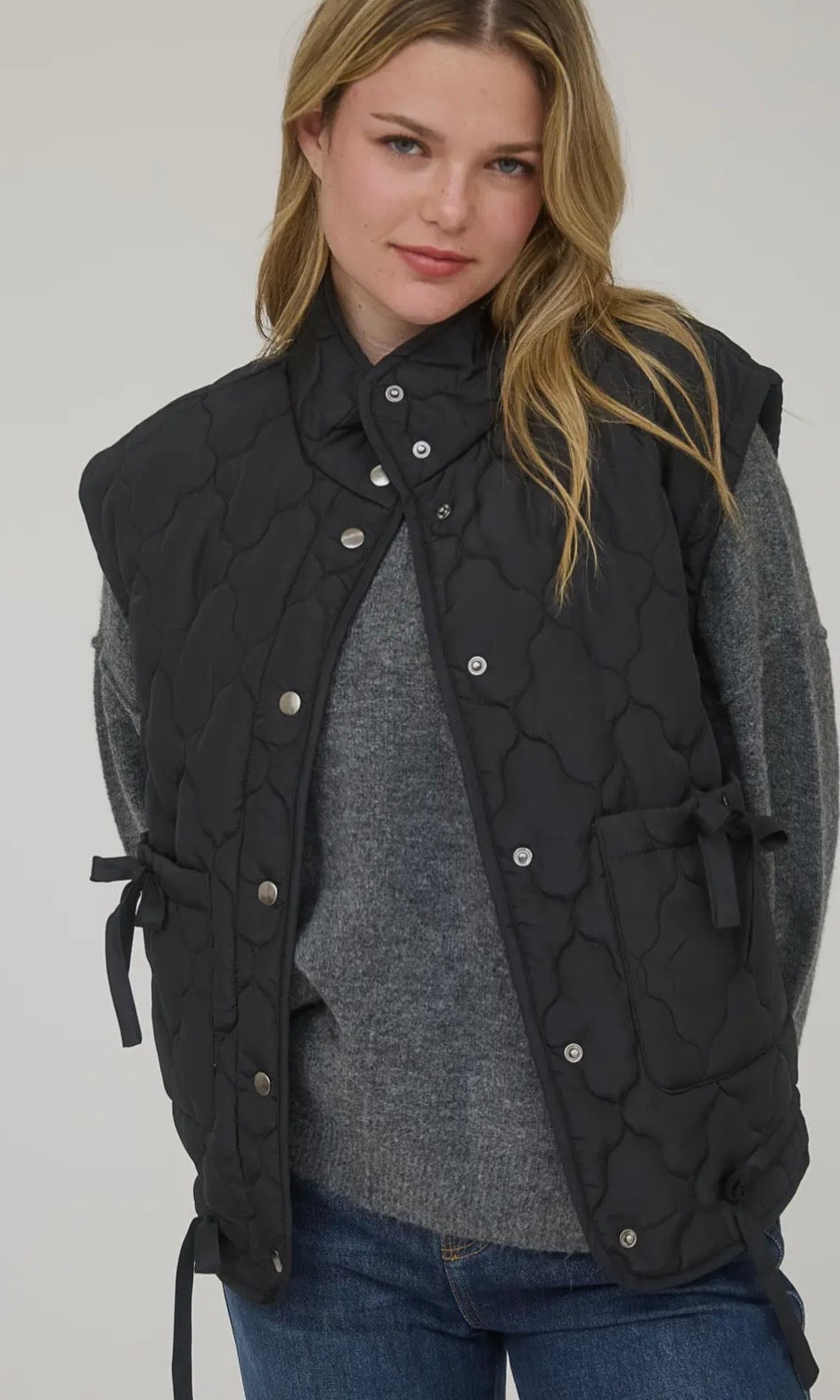 Naomi Black Tie Detail Snap Button Down Quilted Puffer Vest