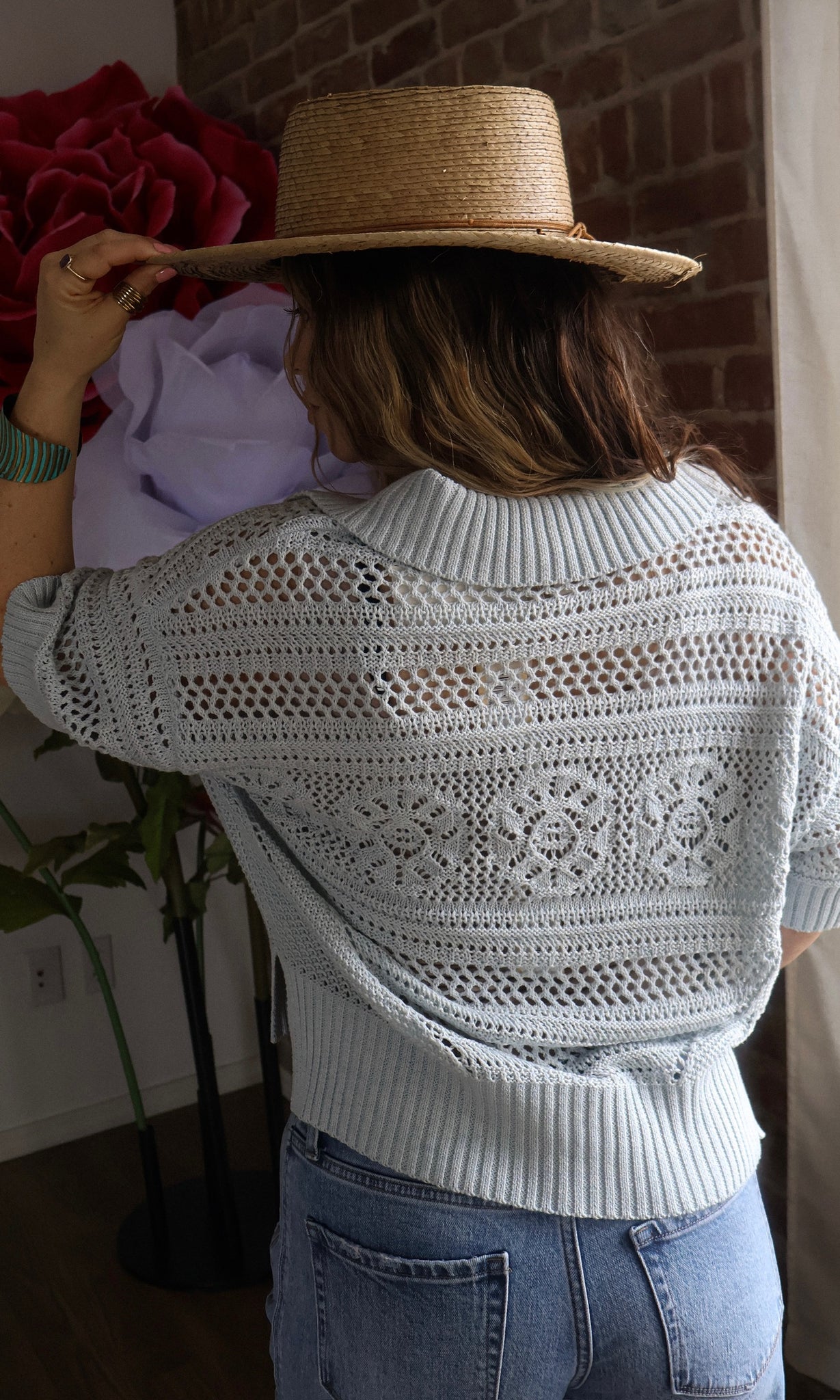 This is the kind of top that instantly feels like a breath of fresh air. With its open crochet texture and relaxed polo-inspired silhouette, it brings an easy, laid-back charm that still feels thoughtfully styled. The short sleeves and lightweight feel make it perfect for warmer days, while the button-down front and classic collar add just enough structure to keep it polished. Finished in a soft Light Blue, this is an effortless piece that works just as well with denim as it does layered over a tank.