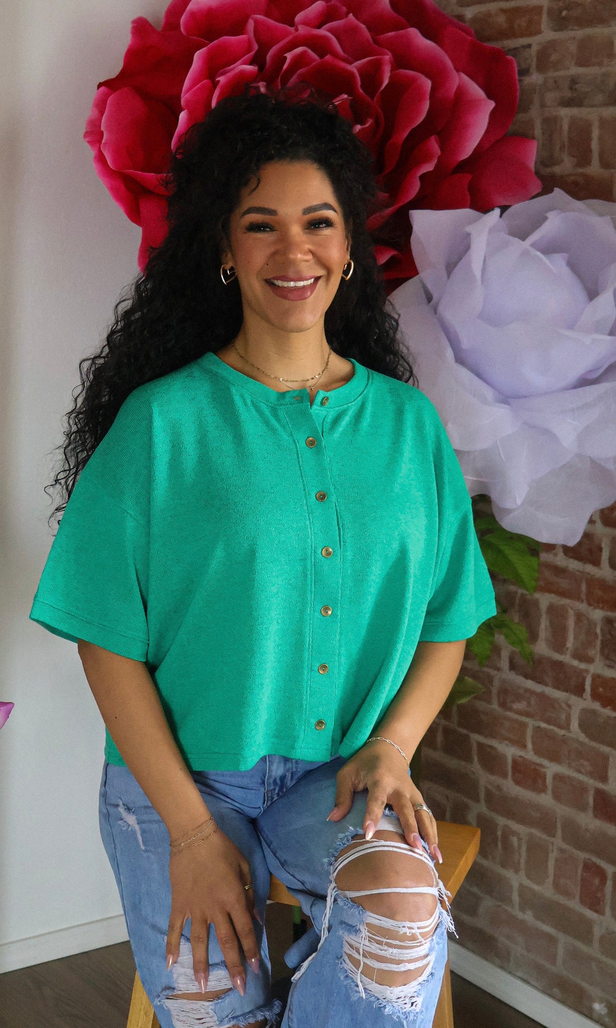 Woman in a green shirt sitting in front of large flowers with a brick wall background