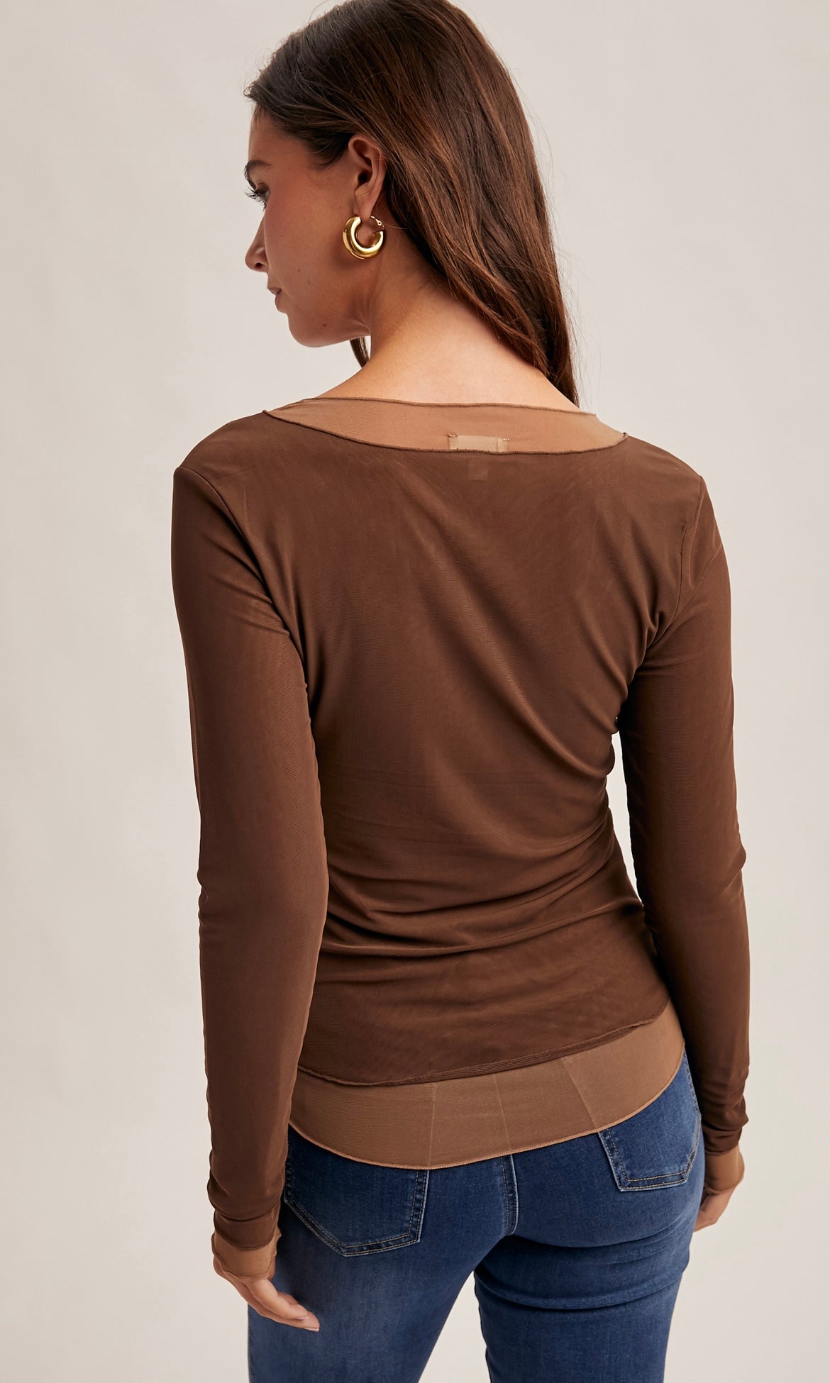 Malia Brown Double Layer Scoop Neck Mesh Top