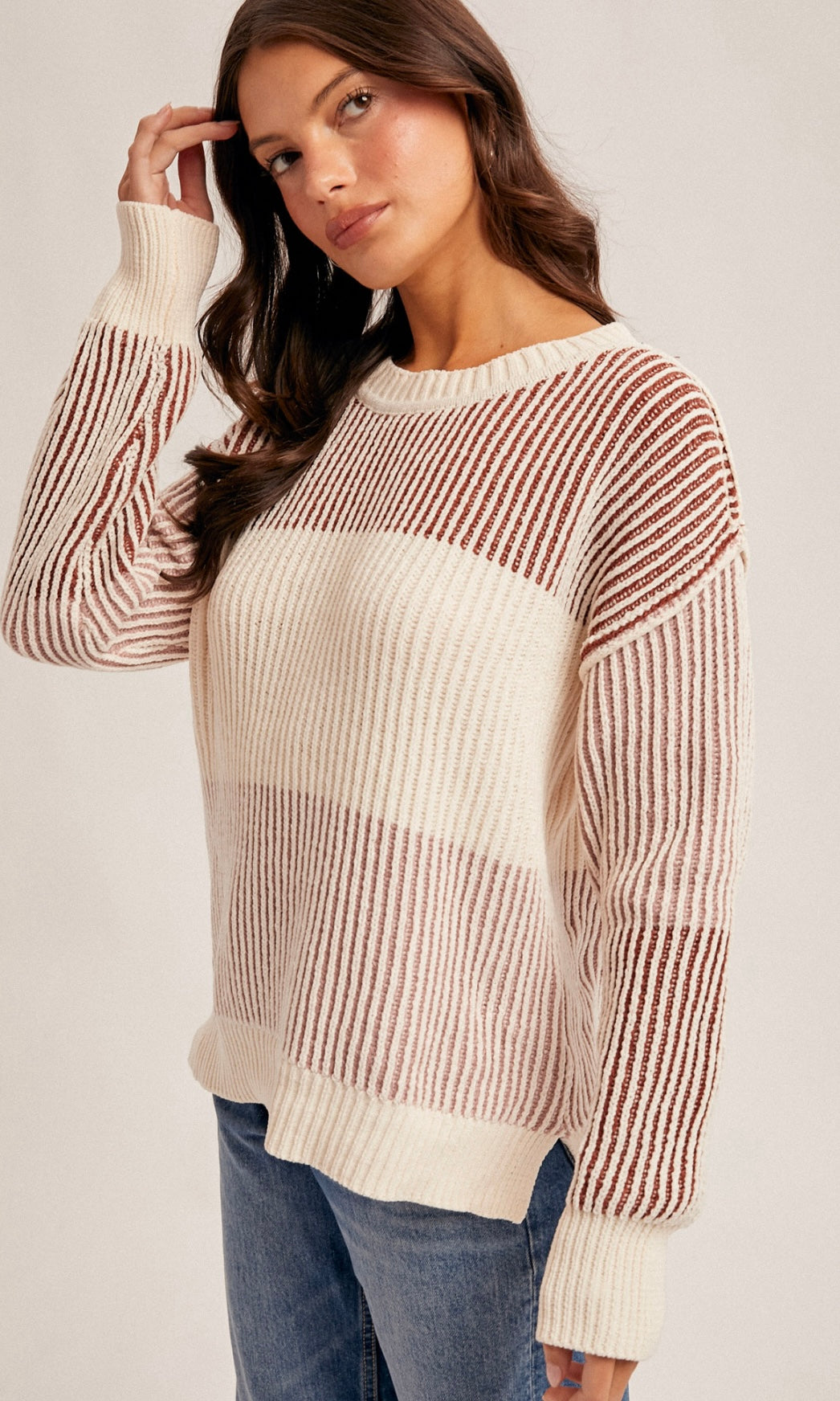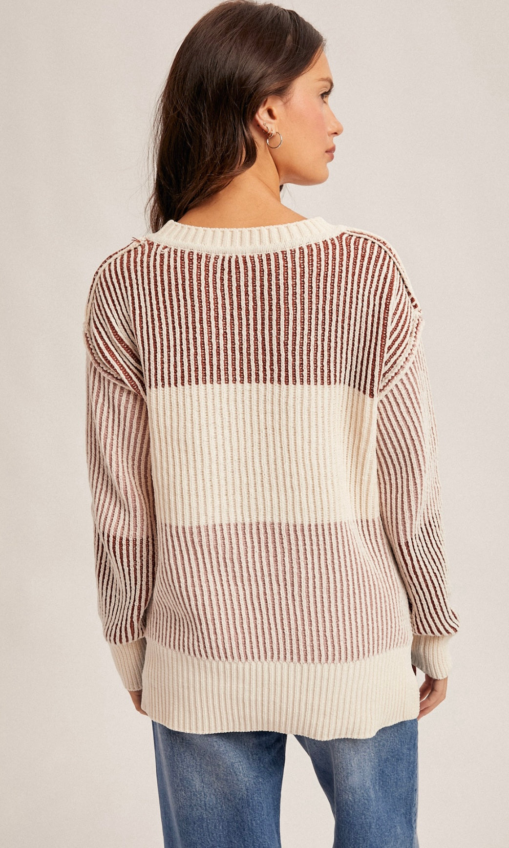 Mary Pink Round Crew Neck Color Block Pullover Sweater