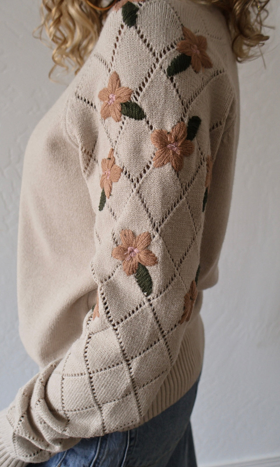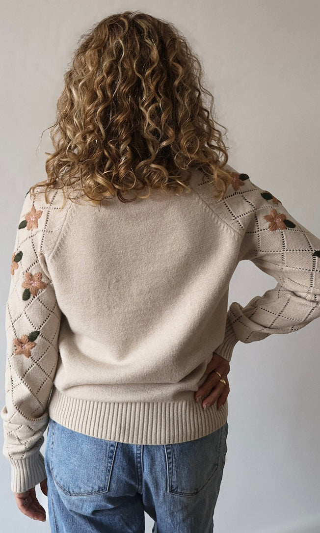 McKenzie Taupe Floral Embroidered Crew Neck Sweater